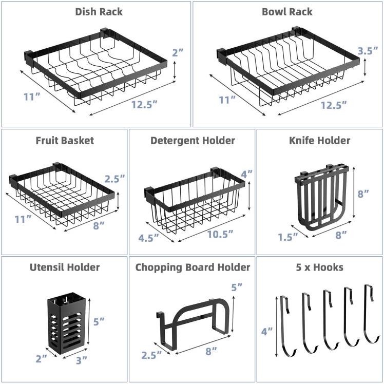 Perfectly fits single or double sinks with the adjustable length from 21" to 39". Over-the-sink design for saving space and auto water drainage. 4 baskets, chopping board and utensil and knife holder and 5 hooks meet any sink storage needs. Anti-rust steel for great sturdiness and durability. Convenient to assemble with clear instruction and complete accessories.
