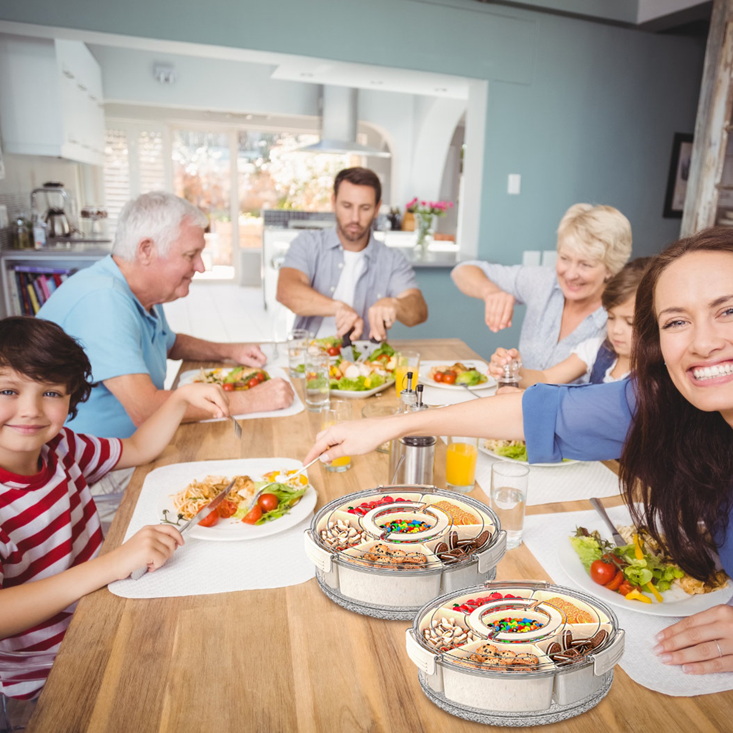 Home > Divided Serving Tray with Lid 360° Rotatable Snack Box Container with 6 Dividers Clear Portable Snack Platters for Fruit Candy Nut Sna
