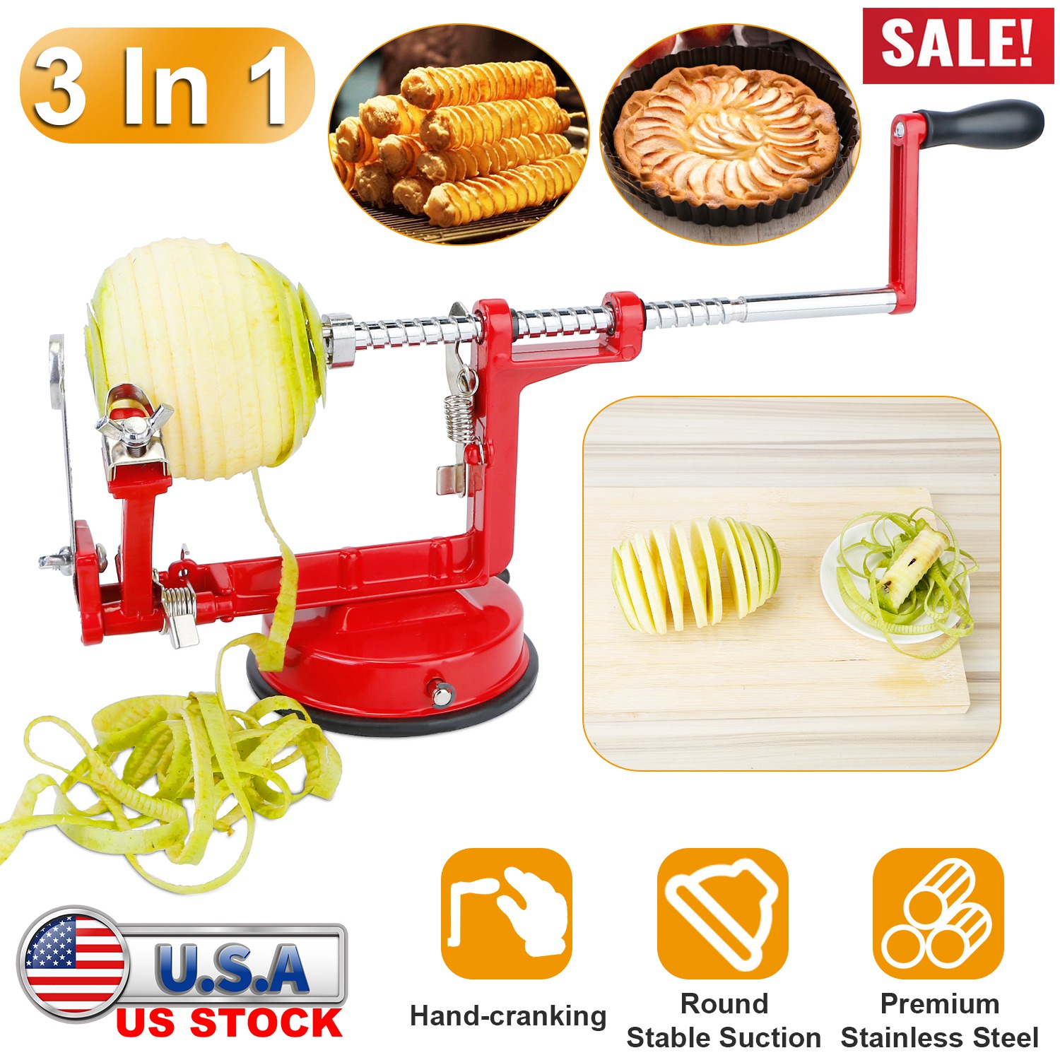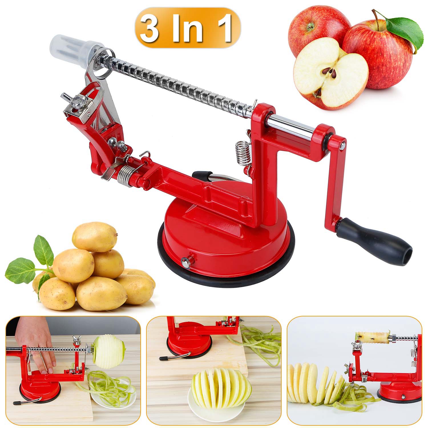 3In 1 Apple Peeler Manual Rotation Potato Fruit Core Slicer Kitchen Hand Cracking Corer w/ Zinc Alloy Peeler Suction Base