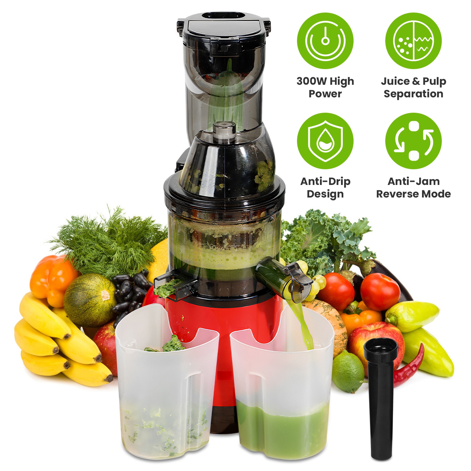 Home > Cold Press Juicer Machine 300W Electric Slow Masticating Juicer for Whole Vegetable and Fruit with Reverse Function 2 Containers Cleaning Brush Clear