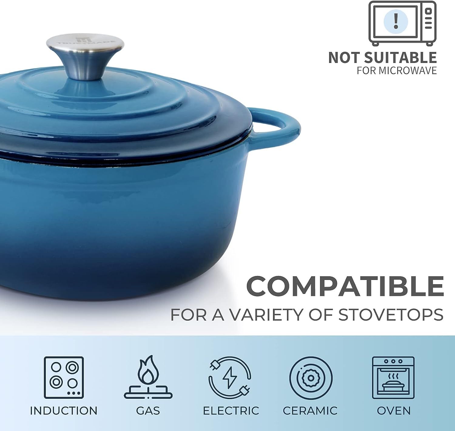 2.ELEGANT & SAFE ENAMEL COATING - Made of thick, heavy-duty cast iron with a glossy & gradient enamel finish and white, non-stick enamel interior. Elegant aqua creates a beautiful table scape for your kitchen. Trustmade dutch oven has exceptional heat conduction, retention, and distribution for reliable cooking