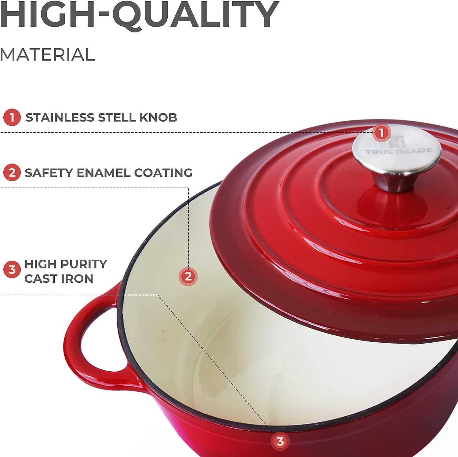2.ELEGANT & SAFE ENAMEL COATING - Made of thick, heavy-duty cast iron with a glossy & gradient enamel finish and white, non-stick enamel interior. Elegant aqua creates a beautiful table scape for your kitchen. Trustmade dutch oven has exceptional heat conduction, retention, and distribution for reliable cooking