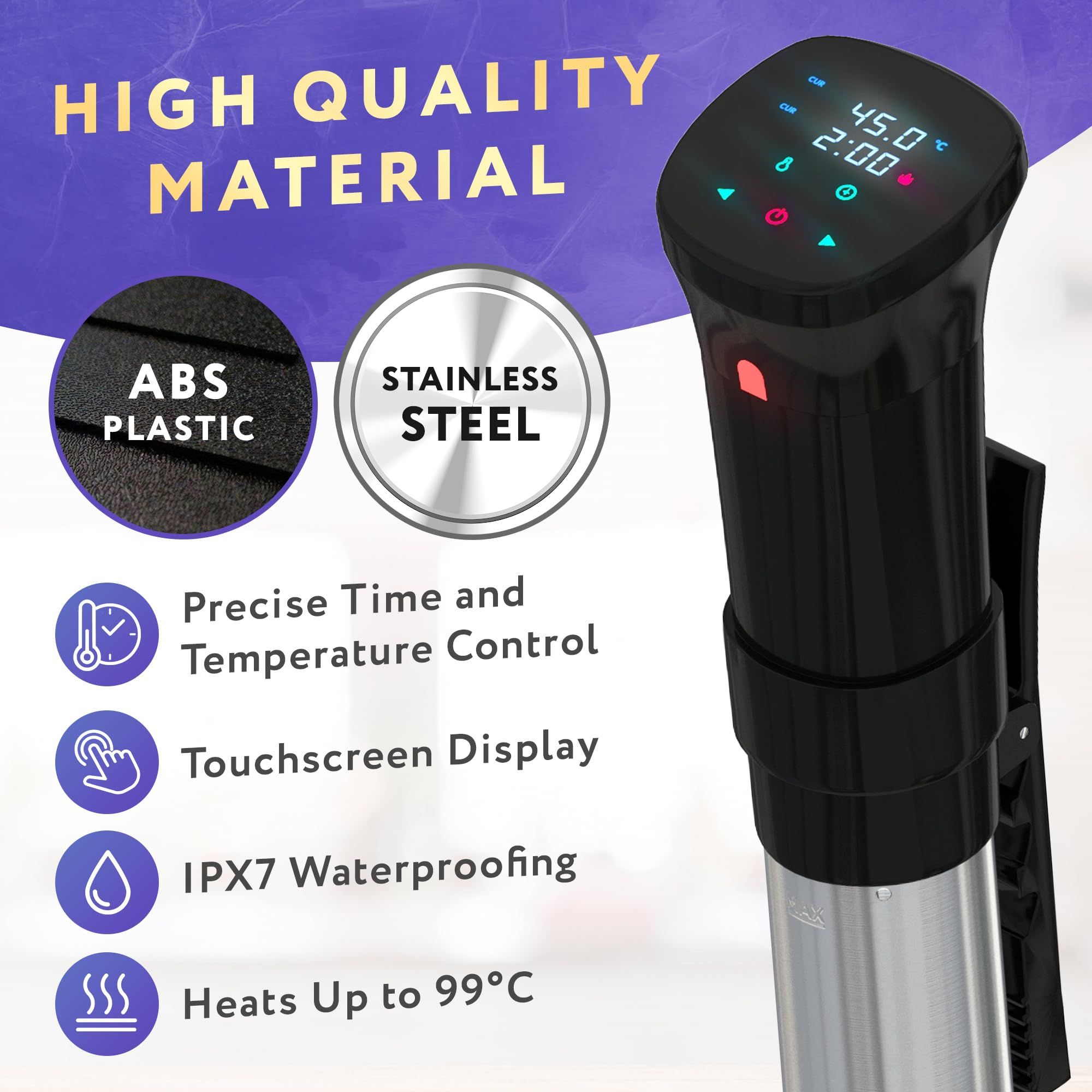 2.Easy to Use and Full Touch Screen Control. Sous vide power precision cooker is simple to use with a button and one knob. A simple design with sloped screen prevents fogging of control panel.