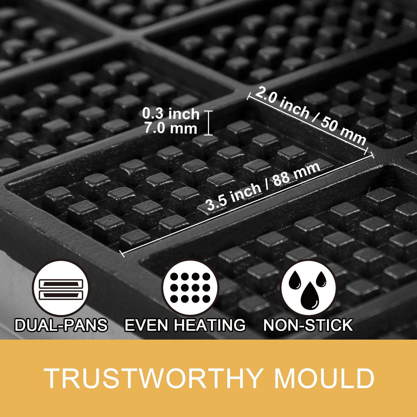 Our waffle maker adopts dual baking pans (upper and lower), with which 10 waffles can be cooked simultaneously. The single mould measures 3.5 in (88 mm) in length and 2.0 in (50 mm) in width, providing rectangle waffles in a depth of 0.3 in (7 mm). Double pans ensure even heating. Teflon coated surface facilitates non-stick cooking and keeps your place neat.